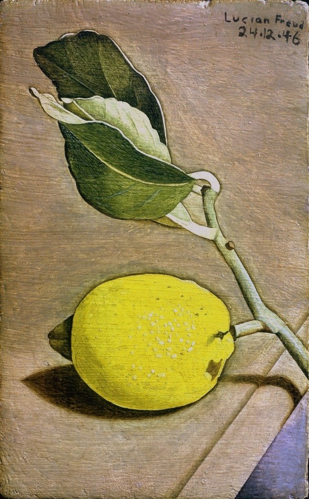 Lucian Freud (German-born British, 1922-2011): Still Life with Lemon, 1946. Oil on panel, 6 x 3-3/4 inches (17 x 9.5 cm). Hazlitt Holland-Hibbert, London, UK. © This artwork may be protected by copyright. It is posted on the site in accordance with fair use principles.